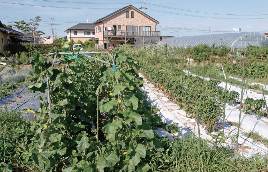 從田地看到的自宅兼店鋪、加工所。西田栄喜一家五口在這裡生活,製作醃漬物、服務客人。(攝影/田中康弘)
