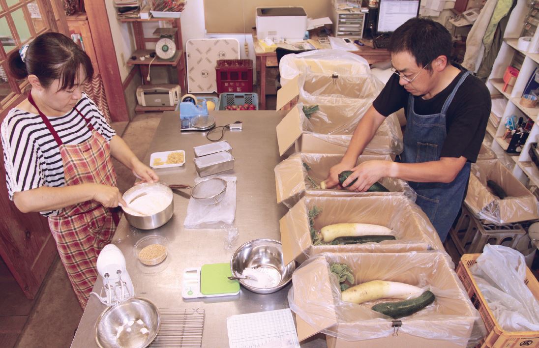 作者為自家「蔬菜組合」裝箱(蔬菜組合即蔬菜箱概念,按不同定價搭配不大相同的蔬菜),準備出貨;妻子正在製作和蔬菜組合一起販售的薑味磅蛋糕,這也是增加價值的一種方式。