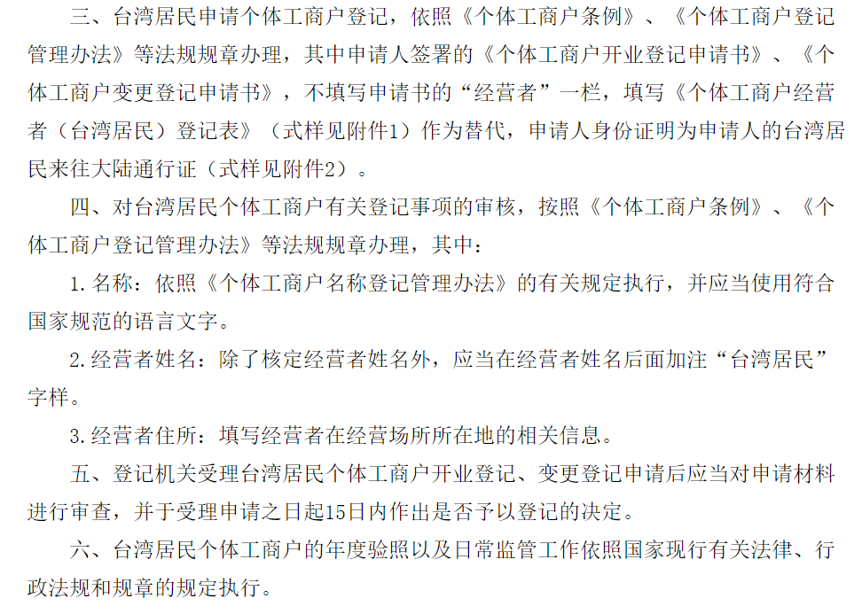 五、臺灣居民在大陸設立個體工商戶的具體登記辦法按照原有登記規範執行。
