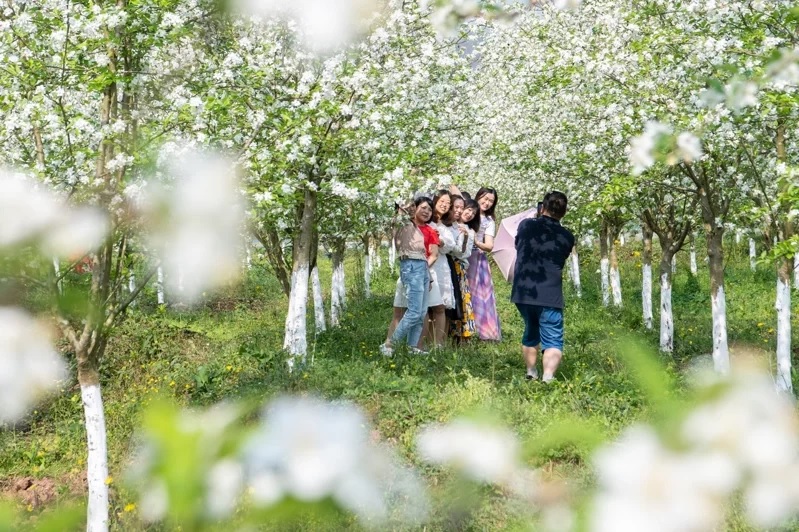 春天百花盛開,遊客在重慶市大足區棠香街道的海棠園內拍照。