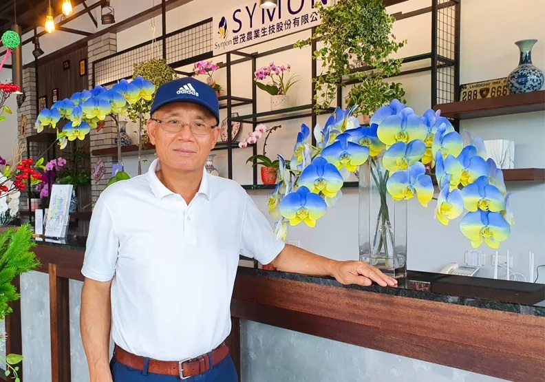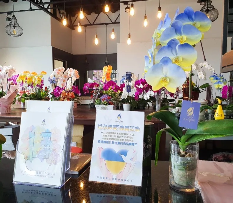 位於台南的世茂,是全球最大蝴蝶蘭切花供應商,創辦人黃崇德一手獨特的奈米噴染技術,為蘭花染上烏克蘭國旗的藍黃雙色,以聲援烏克蘭。
