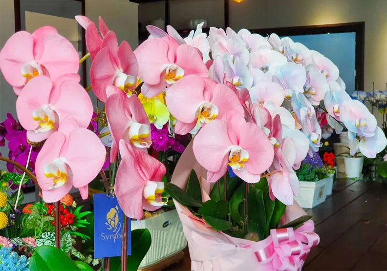 走進黃崇德的辦公室,映入眼簾除了雪白色的原色蝴蝶蘭,還有各種夢幻的色調,粉色與紫色漸層,在雪白的蝴蝶蘭花瓣上暈染開來,渾然天成彷彿本就如此,完全不顯得矯揉人工。