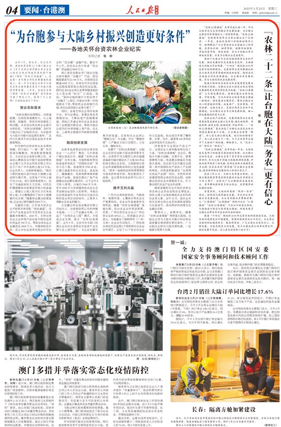 乘勢而上,奮楫爭先。隨著“農林22條措施”持續落實落細,台胞台企參與大陸鄉村振興和農林業高質量發展將擁有更好條件,廣大台胞台企抓住大陸發展機遇,一定能夠實現更大發展。