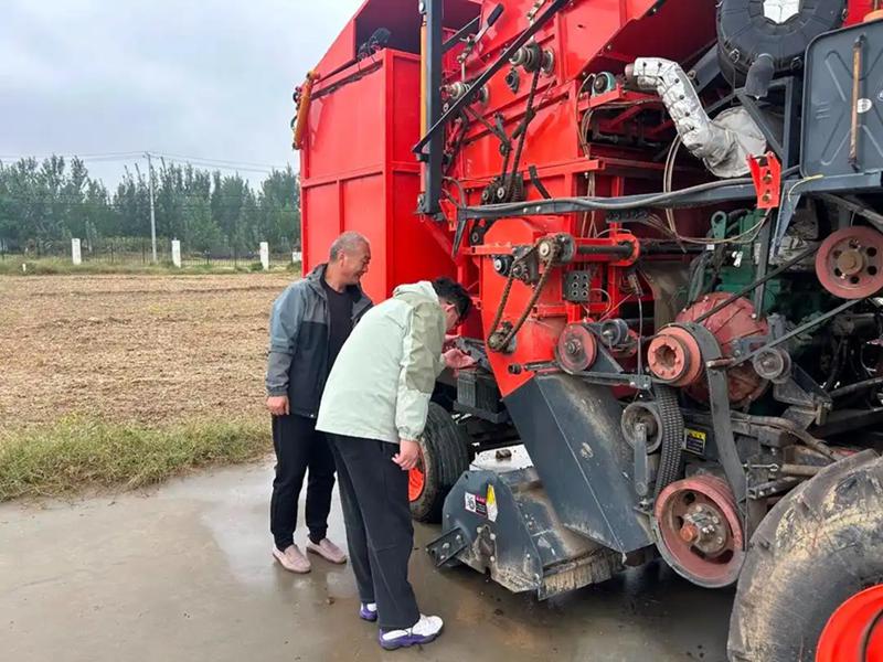 光有合適的農機還不夠,怎麼科學搶收才能減少損失也很重要。山東種業智科農業服務集團有限公司(以下簡稱智科農服)的農技專家們深入田間地頭,與農戶一起查看地塊情況,給予具體的指導。在德州的一片玉米地,農技員李保一蹲下來摸了摸土壤濕度,跟農戶說:「你這塊地積水少,土壤相對乾一點,用普通的輪式收割機就行;東邊那片窪地泥太深,得用履帶式收割機;還有旁邊那幾小塊零散的地,反而建議組織人工搶收,免得拖延時間。
