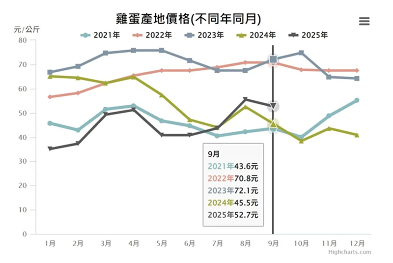 今(2025)年雞蛋供應雖暫時回穩,市場更時常傳出「剩蛋」消息,但疫情與氣候仍潛藏變數。7月雲林、8月與9月彰化相繼出現H5N1禽流感疫情,撲殺逾萬隻蛋雞,時間點正值候鳥回台的秋冬交替期。依防檢署統計,11月至明年3月為禽流感高峰期,一旦疫情升溫,恐再度衝擊市場穩定;另一方面,8月蛋商公會曾宣布每台斤漲價2元,反映風災後物流與飼料成本,近期秋颱「風神」生成,再度引發市場對供應波動的隱憂。