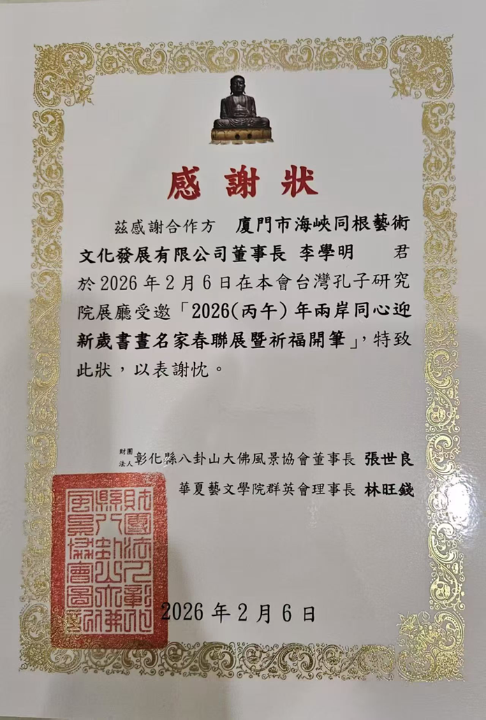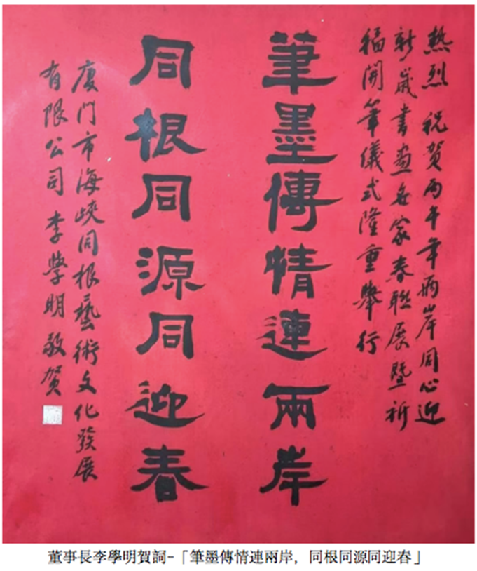 作為大陸協辦方的核心代表,廈門市海峽同根藝術文化發展有限公司董事長李學明特意發來賀詞-「筆墨傳情連兩岸,同根同源同迎春」,短短十二字既飽含對活動的熱烈祝賀,更點明了兩岸文化血脈相連、精神相依的核心主旨。長期以來,李學明董事長始終深耕兩岸文化交流領域,帶領企業搭建起眾多兩岸藝文互動平臺,從海峽論壇配套藝術活動到兩岸青年文化交流項目,始終以「同根同源」為信念,推動兩岸同胞在文化互鑒中深化心靈契合 ,此次協辦春聯展,更是將這一理念融入傳統節慶文化之中,讓筆墨間的溫情跨越海峽阻隔。