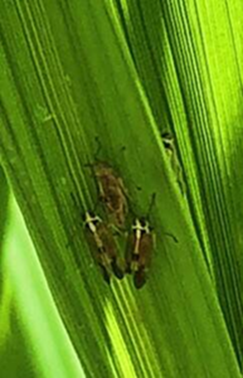 白背飛蝨成蟲聚集於水稻葉片上吸食危害。