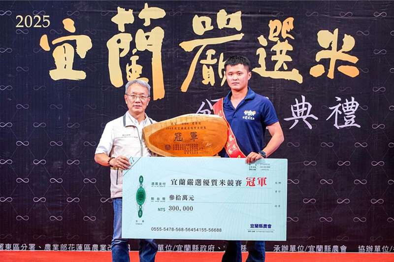 今天公布宜蘭嚴選米得主,冠軍是冬山鄉農會劉耀群,獨得30萬元獎金,亞軍壯圍鄉農會藍崧愷,季軍頭城鎮農會蕭宇廷,優選有冬山鄉農會馬慶任、劉宇濬、楊建鐘,以及三星地區農會簡桂賢、宜蘭市農會葉水盆,人氣王是礁溪鄉農會黃正為。