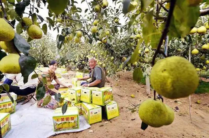 在萊陽市「梨滿田園」鄉村振興齊魯樣板省級示範片,果農正在採收成熟的梨子。