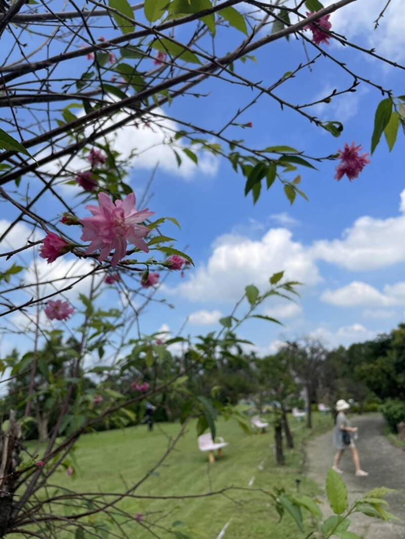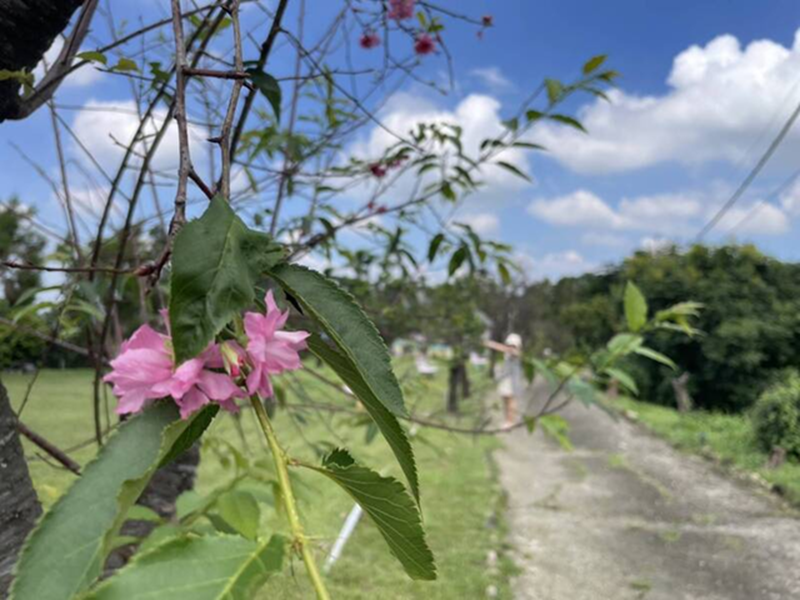 農場負責人黃景鴻指出,7月丹娜絲颱風從嘉義布袋登陸,古坑遭11、12級強陣風橫掃,園區多棵老樹攔腰傾倒,櫻花樹葉子全被掃落光凸凸,9月中旬後不僅長葉子還陸續開花,且越開越多。