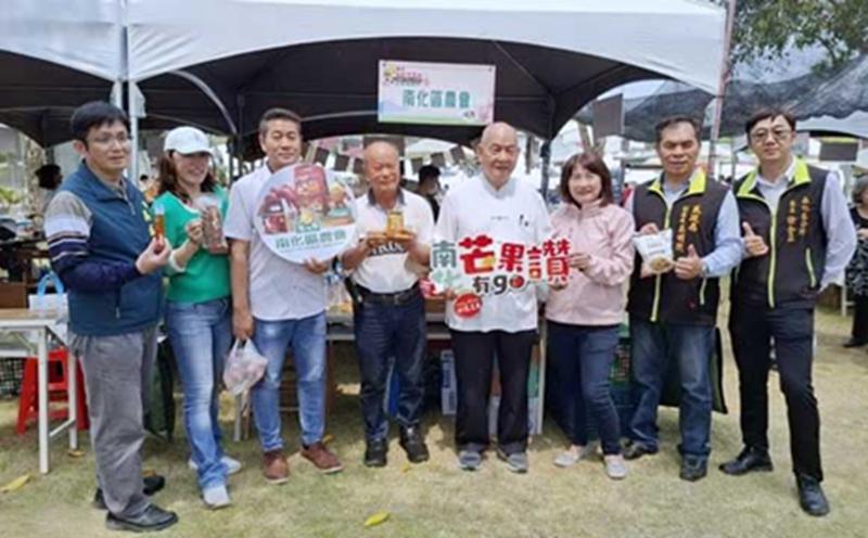 南市長黃偉哲牽手劉育菁、農業局副局長吳威達、民政局副局長吳明熙、南化區長徐全立出席活動,也向各界推薦南化區農特產。